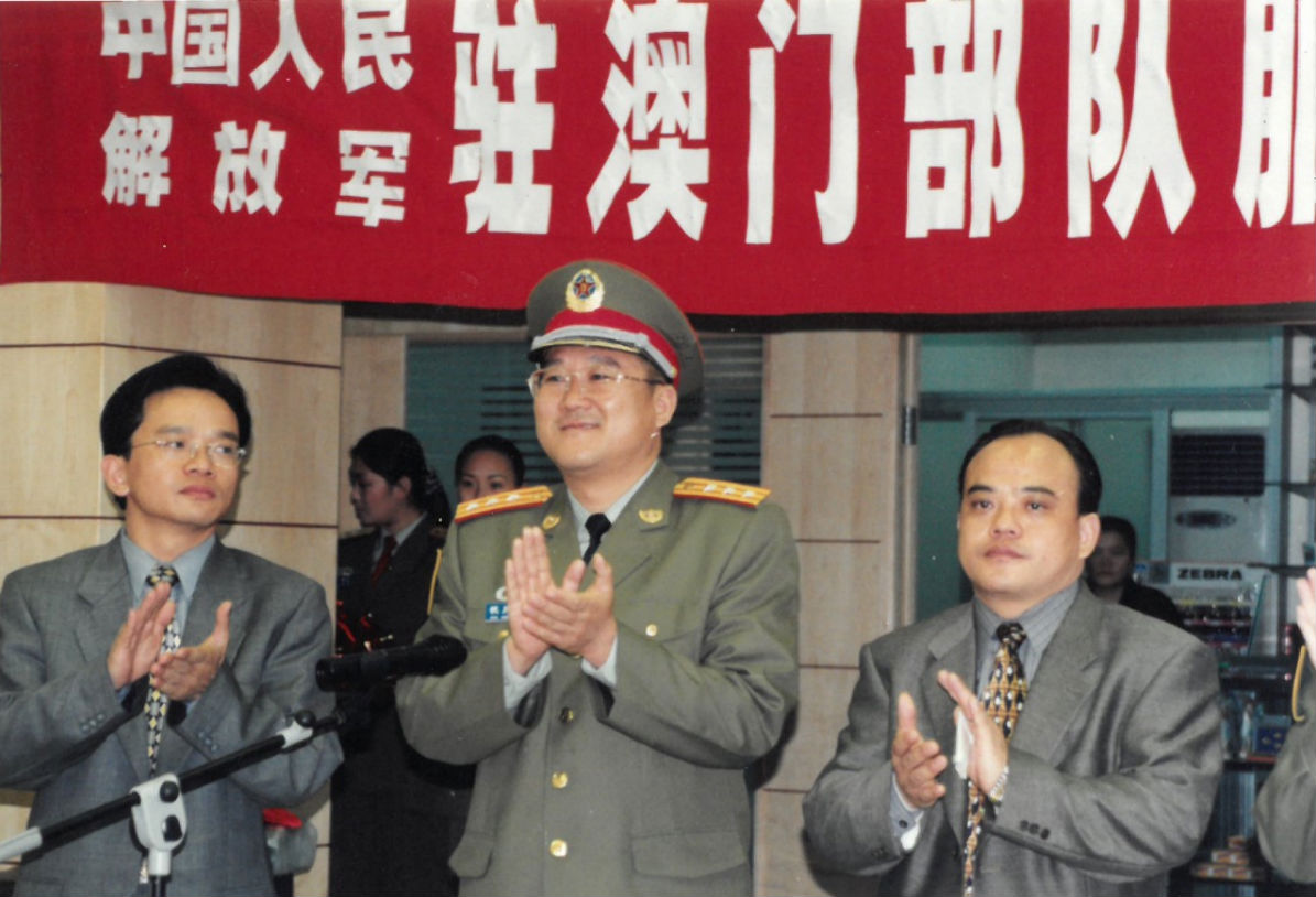 禹主席与驻澳门部队司令员朱庆生在开业仪式上 禹主席与刘粤军、政委张阳一起观看演出
