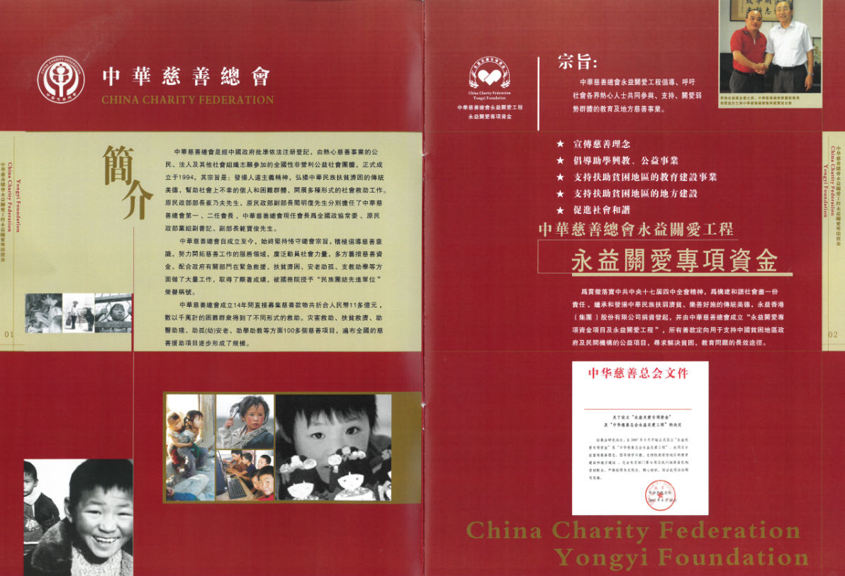 中华慈善总会永益关爱基金创立于2007年8月,由永益香港(集团)有限公司捐资发起,并在中华慈善总会设立“永益关爱专项基金及永益关爱工程”,旨在宣传慈善理念,倡导助学兴教,支持扶助贫困地区的教育和地方建设。