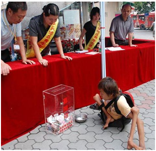 感动之余,工作人员赶紧把捐款箱放到残疾乞讨者的面前。