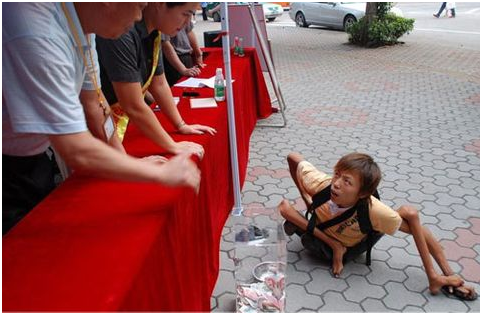 他,是一名身患残疾、无法直立行走的乞讨者;他,来到捐款箱前,把仅有的30多元全部放了进去。他的举动被热心路人用相机记录下来放到网上,迅速成为各大论坛的热帖。