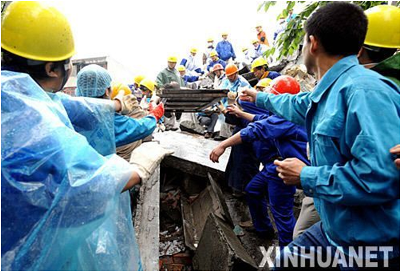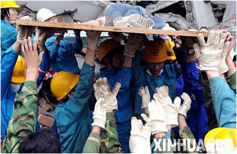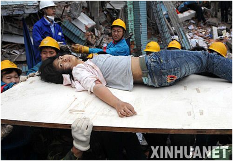 2008年5月13日,在四川地震重灾区之一――四川绵竹县汉旺镇,救援人员经过十几小时的艰苦努力,终于从废墟中救出一位女青年。新华社记者 李晓果 摄