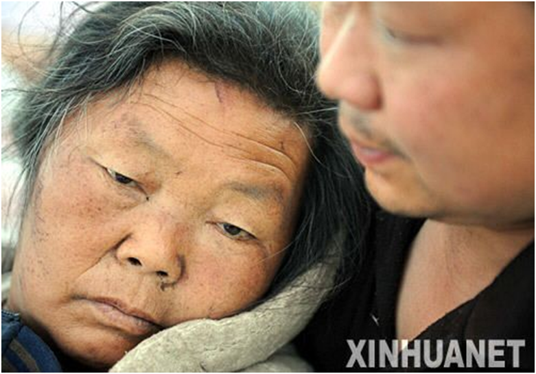 2008年5月13日,在四川绵竹县的一处临时救援中心,一位男青年陪护着受伤的母亲。 新华社记者 李晓果 摄
