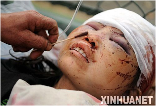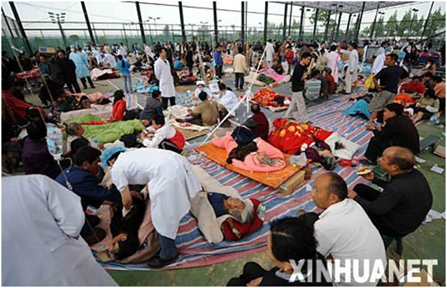 5月13日,在四川绵竹县的一处临时救援中心,医务人员在医治伤员。 新华社记者 李晓果 摄