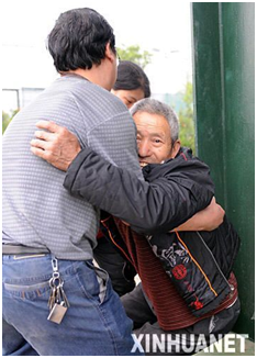 5月13日,在四川绵竹县的一处临时救援中心,一位男青年在扶助一位受伤的老人。 新华社记者 李晓果 摄
