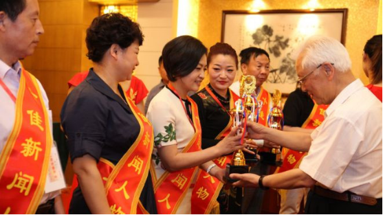 接着,在大地之星会歌的欢快乐曲中,周铁农副委员长给身披绶带的本届中华大地之星十佳新闻人物、百佳新闻人物、特邀新闻人物、优秀新闻文化工作者、特等奖作者亲切握手、颁发金光闪闪的奖杯。