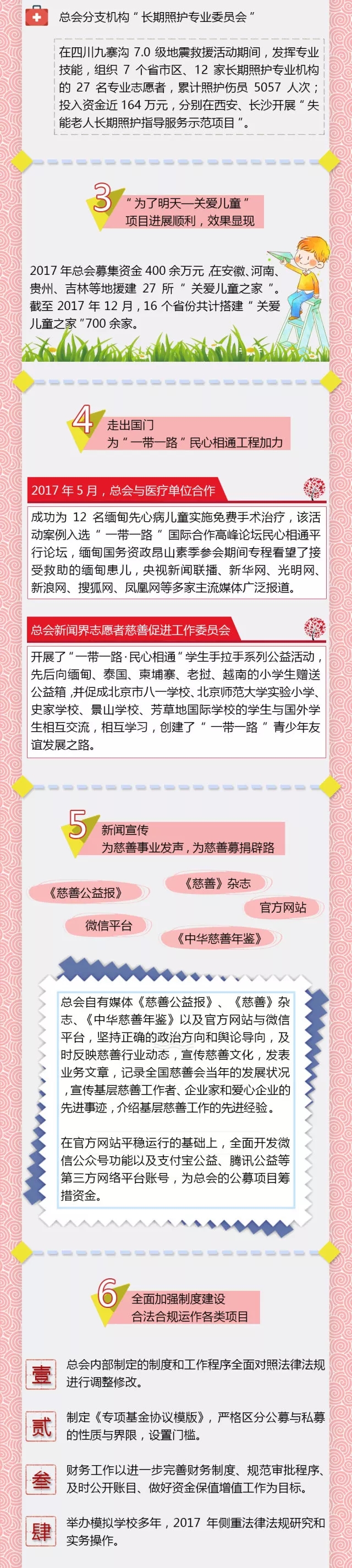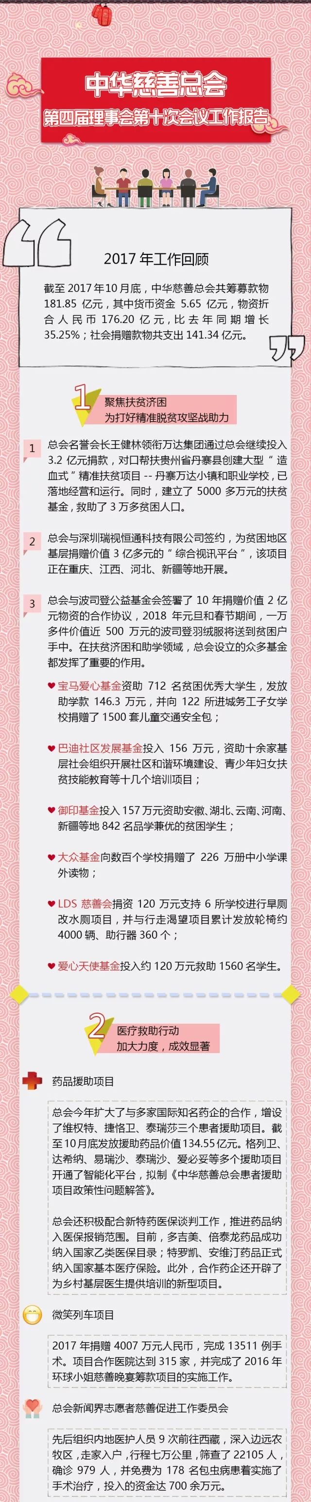 2017年,总会以学习贯彻十九大精神为核心,以深入践行《慈善法》为指引,以“多谋民生之利,多解民生之忧”为出发点,规范运作,开拓前行,社会各界与慈善工作者、志愿者齐心同力,取得了良好成效。
