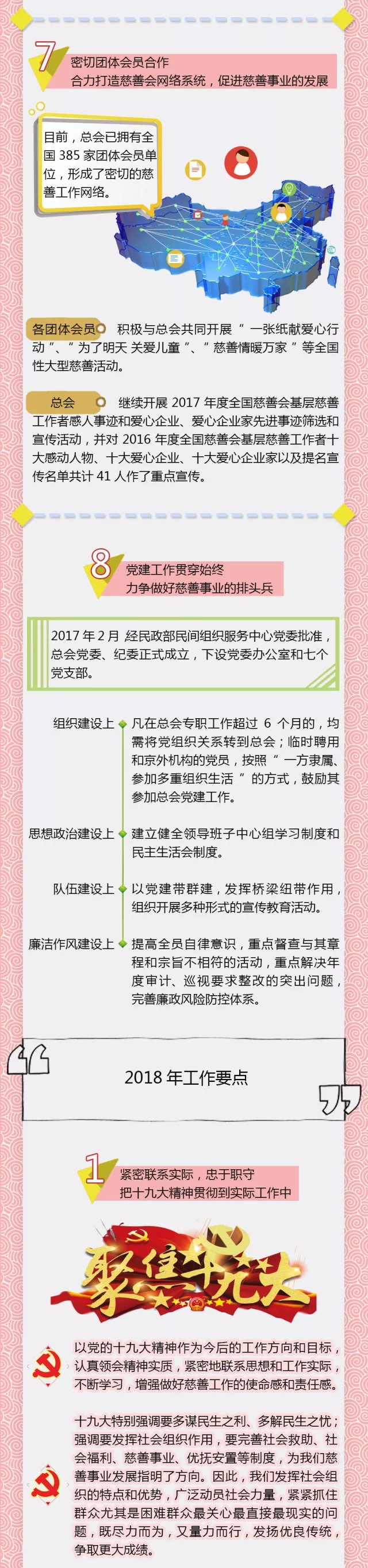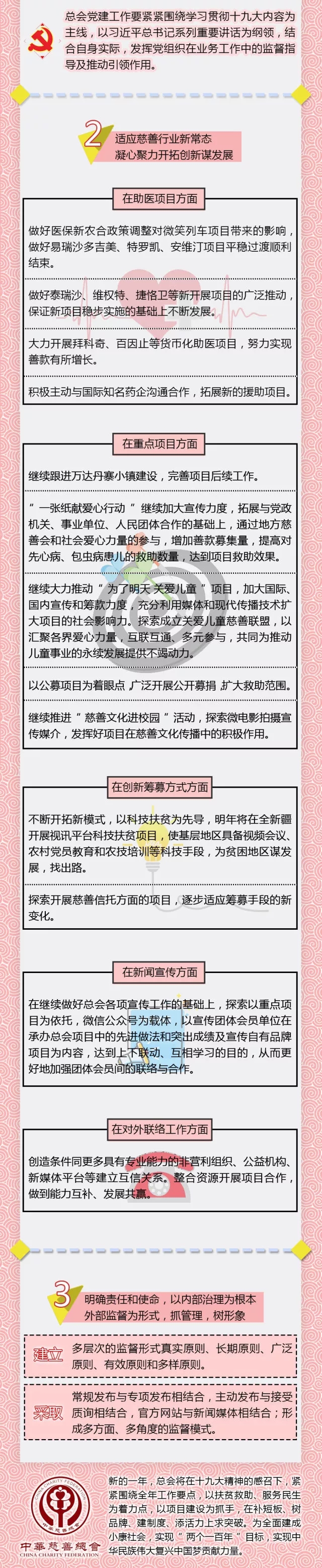 2018年总会工作总的指导思想是:以党的十九大精神为工作方向,以《慈善法》为工作准绳。在规范运作的基础上,进一步加大重点项目的实施力度;进一步拓宽慈善参与面,增加慈善募集渠道;进一步加大救助力度,完善救助机制,以满足救助需求的多样化;进一步关注民生热点问题,聚焦边缘弱势群体,不断在作为社会保障有益补充方面做出适应总会自身特点的新成绩。
